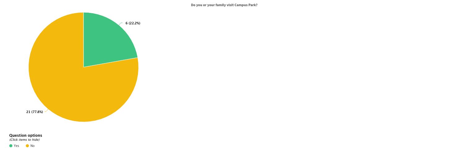 77.8% of participants do not visit Campus Park. 47.6% of participants said they did not know about the park and 38.1% of participants said there is nothing to do at the park.