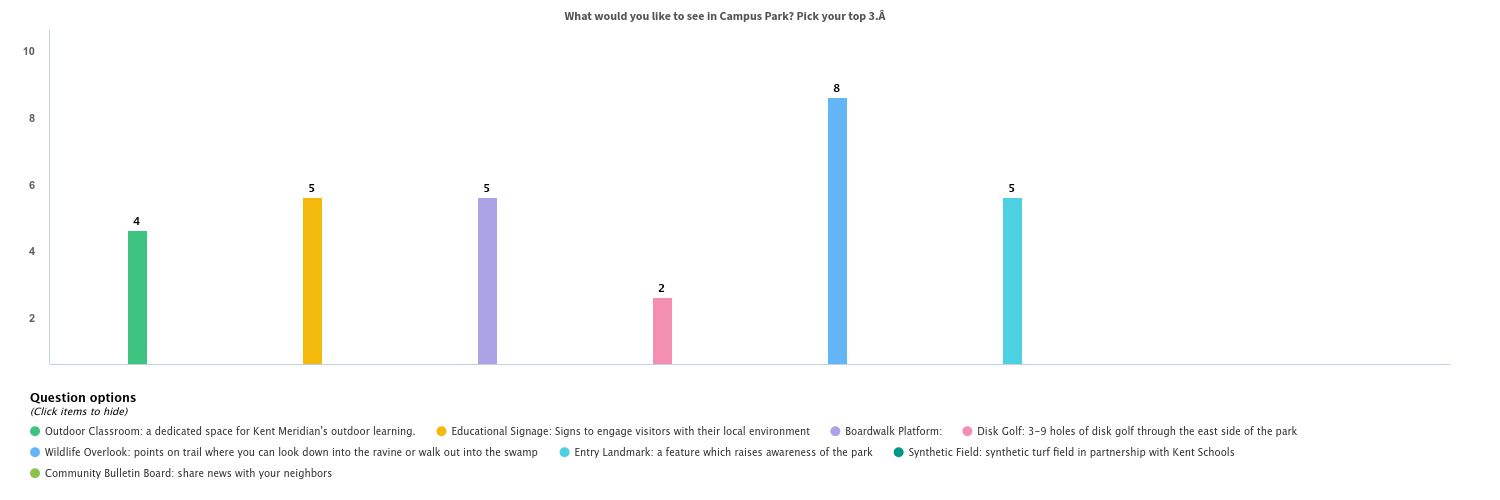 We asked for your top 3 picks for what you would like to see in the park. The top choice was Wildlife Overlook, followed by a 3-way tie between Entry Landmark, Educational signage, and Boardwalk Platform.