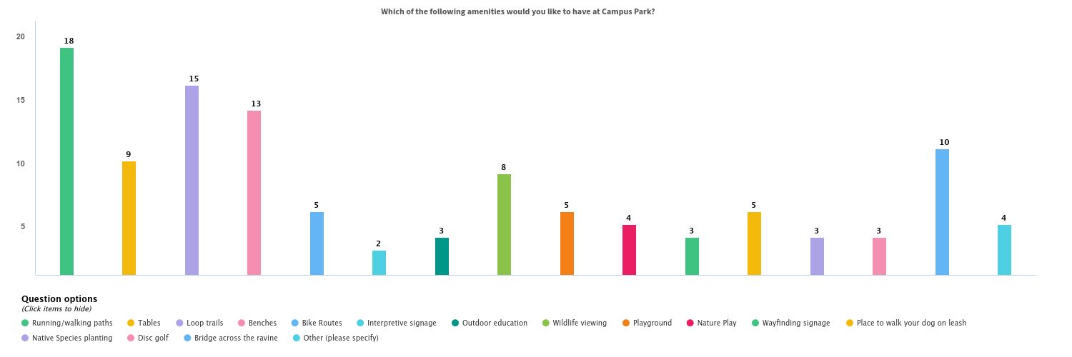 When asked what activities participants would like to see at Campus Park the primary answer was running/walking paths, followed closely by loops trails, and benches.