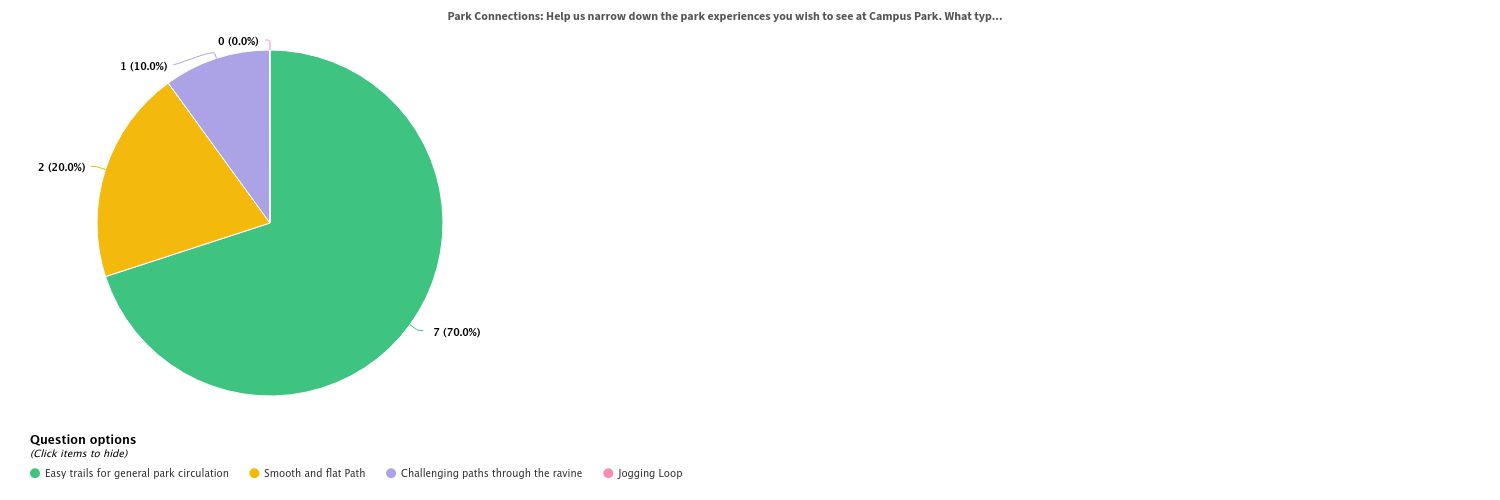 Thank you for participating in the Campus Park Round 2 Engagement. Below are the results. We heard that the public wanted walking/running paths at Campus Park, and we wanted to know which types of paths were most wanted. 70.0% of respondents said they wanted easy trails for general park circulation followed by 20.0% saying smooth and flat paths.