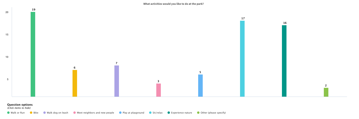 When asked what activities participants would like to do the answers were walk or run, sit/relax, and experience nature.