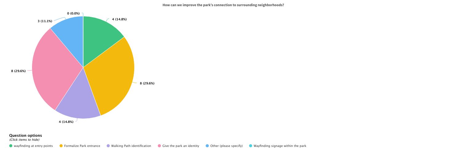 Because many participants did not know about Campus Park, we asked how we could improve the park’s connections to the surrounding neighborhoods. The answers were 29.6% each for “Formalize the Park Entrance” and “Give the Park an Identity”.