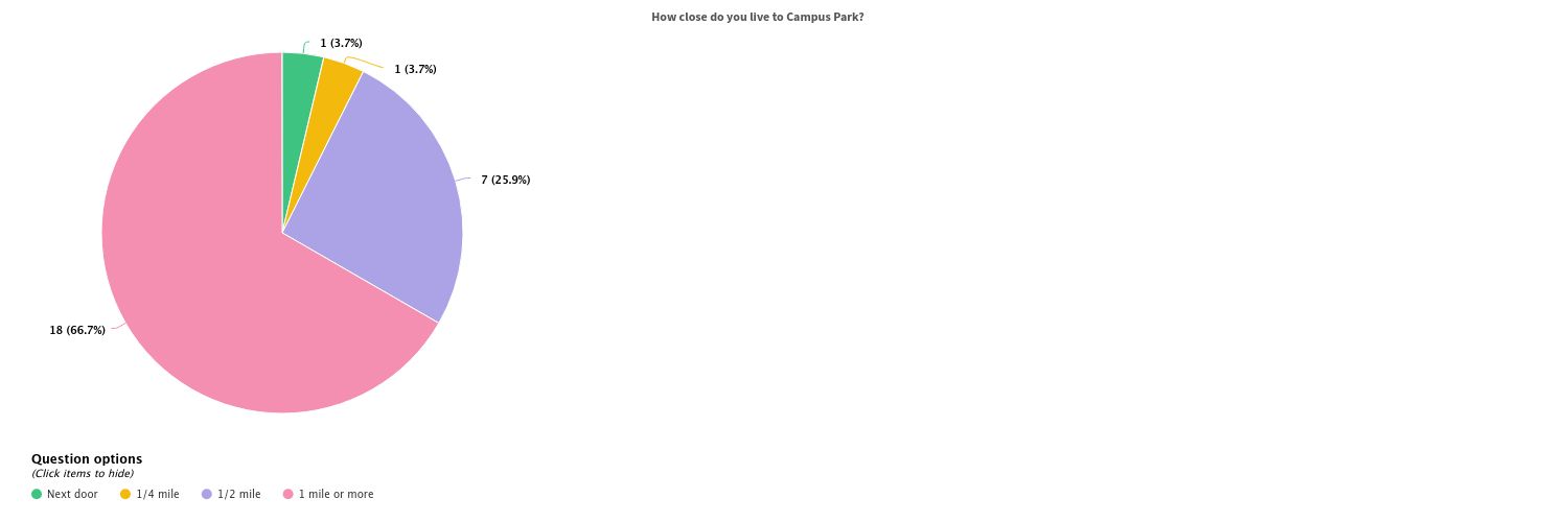 Campus Park is a neighborhood park in the Parks and Open Space Plan and 66.7% of those who took the survey live 1 mile or more from the park.