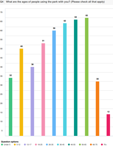 As see here in Question 1, 72.9% of people who responded to the survey live 1 or more miles away. But in Question 2, 66% of respondents say they have visited Garrison Creek either occasionally (41%) or Never (25%). This shoes that those do not live within walking distance of this neighborhood park. Of those that responded the ages that are most represented in were 26-65 with 56-65 being the highest and 46-55 being the second highest.